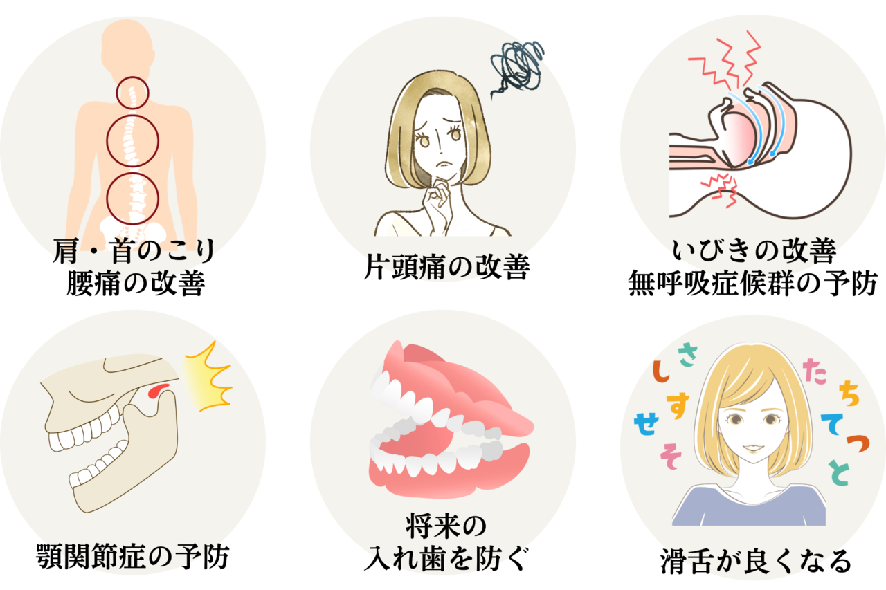さらに顎関節症の予防、いびきの改善、滑舌が良くなる、虫歯や歯周病になりにくい、といったメリットもあり、今よりもっと健康的な生活が送れます。