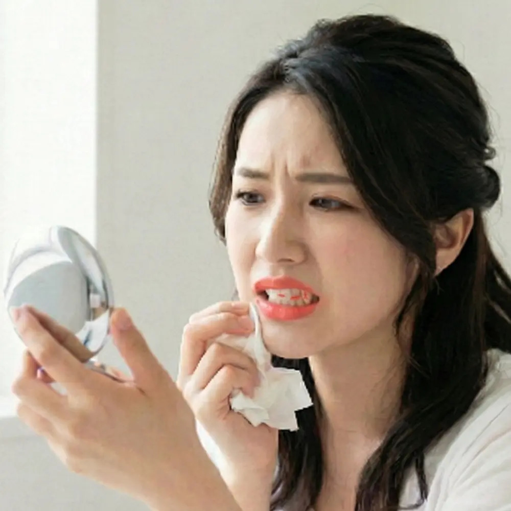 リップやグロスを塗っても、すぐに前歯についてしまう。塗り直しても、また歯につく。