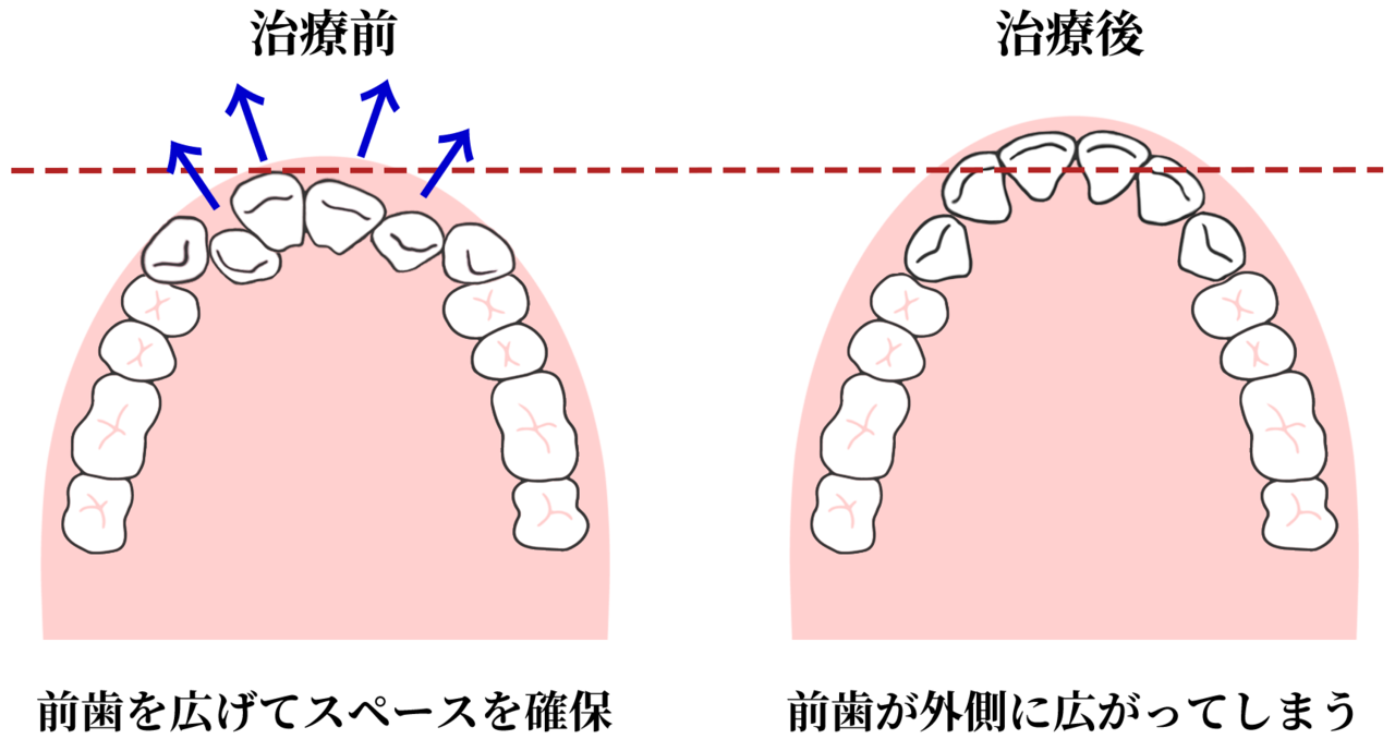経験不足の歯科医師の場合、広げすぎてしまって、歯が外側に斜めに傾斜してしまい、出っ歯や口ゴボがかえってひどくなるケースが少なくありません。